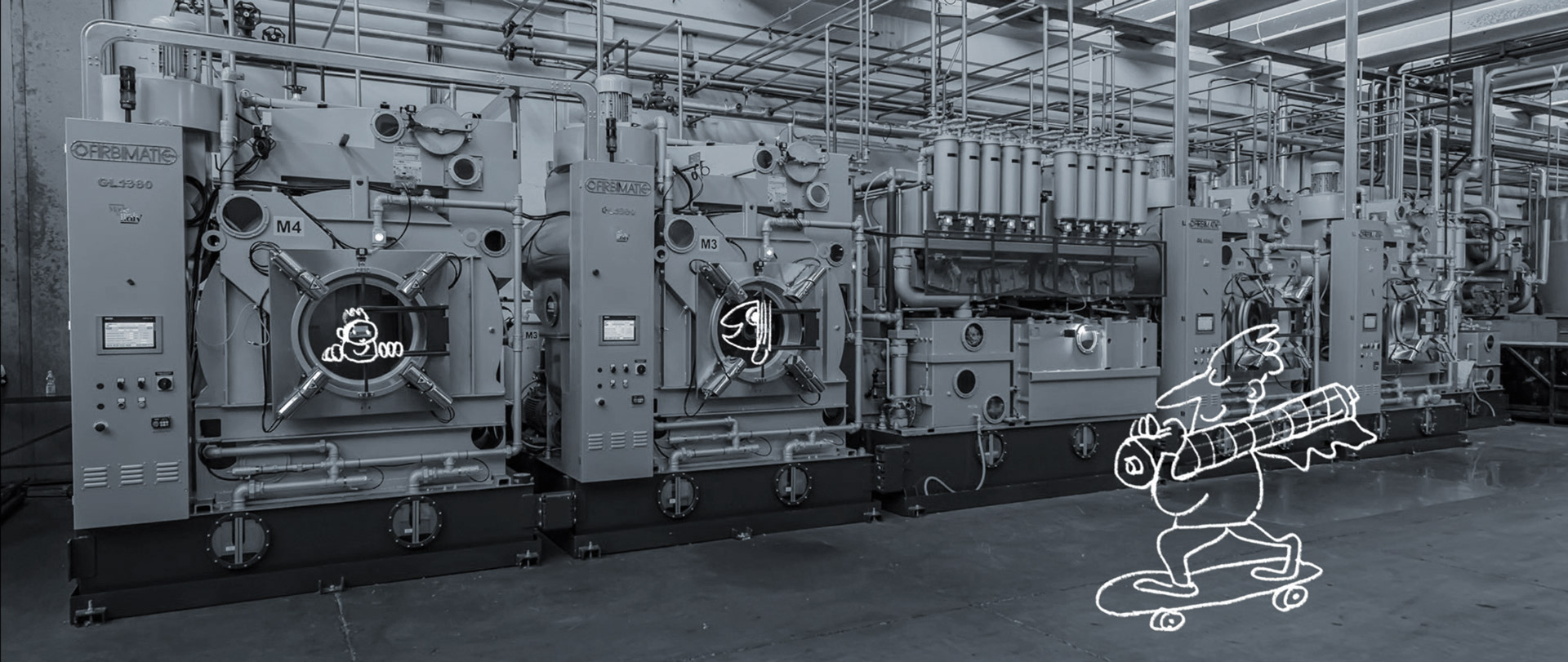 Il reparto, per poter soddisfare il requisito di qualità che il lavoro richiede, si compone di tre tipologie di macchine: per il lavaggio in continuo e per quello in discontinuo e Poly Clean.